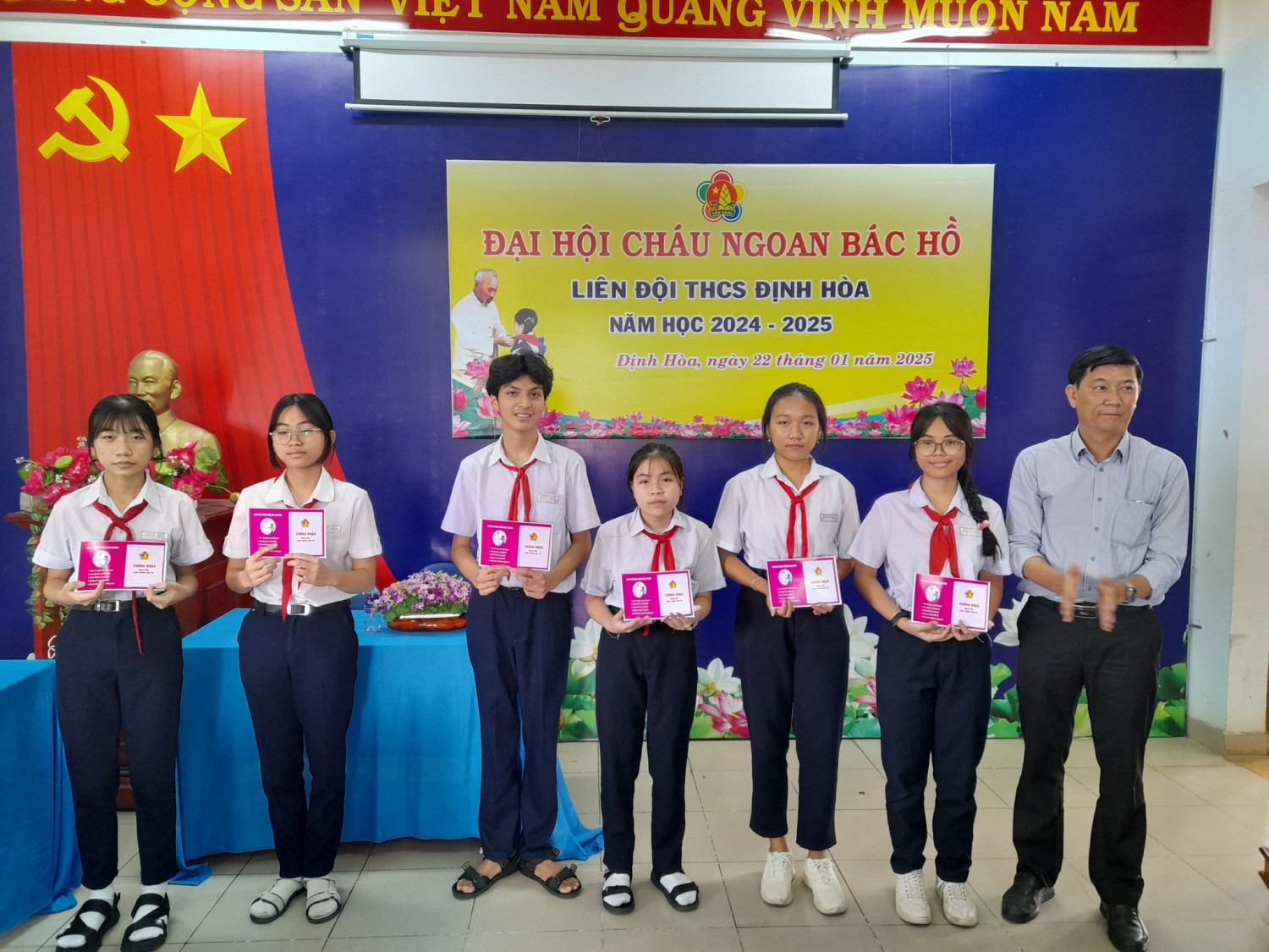 Tại Đại hội, Hội đồng đội phường Định Hòa và Liên đội trường THCS Định Hòa đã biểu dương và trao giấy chứng nhận cho 58 đội viên đạt danh hiệu Cháu ngoan Bác Hồ năm học 2024-2025./.