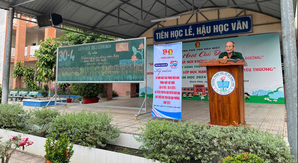 Nhân dịp kỷ niệm 50 năm Ngày Giải phóng miền Nam, thống nhất đất nước, được sự chỉ đạo của Hội đồng Đội phường Định Hòa, Sáng ngày 14/4/2025, Liên đội Trường THCS Định Hòa đã tổ chức chuỗi hoạt động chào mừng, kết hợp tuyên truyền về chủ quyền biển, đảo cho thiếu nhi trên địa bàn phường.