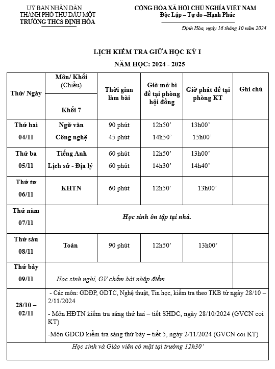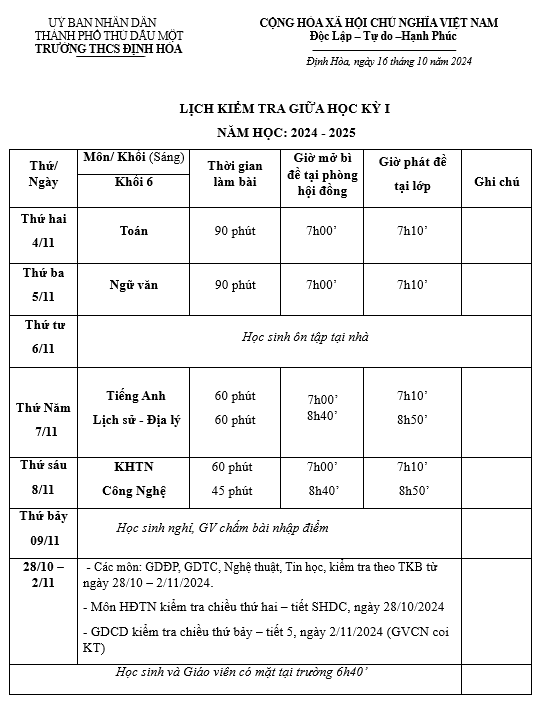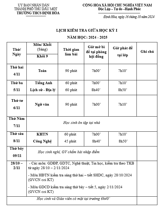 Thông báo Lịch Kiểm Tra Giữa HKI Năm Học 2024 - 2025
