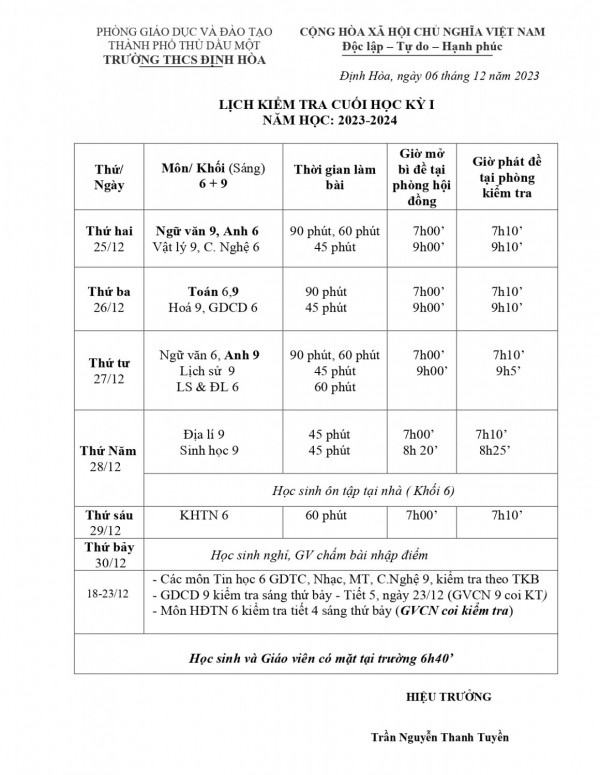 Thông báo Về việc tuyển sinh lớp 6 đại trà năm học 2024 - 2025 của Trường THCS Định Hòa
